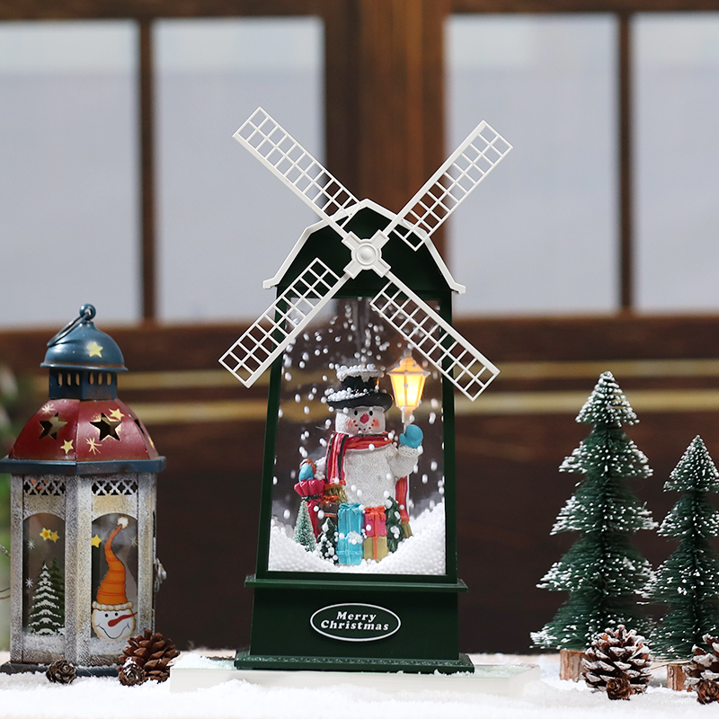 windmills lights color:greeninside view: gifts bag snowy manlights:LEDlights music:Xmasmusic